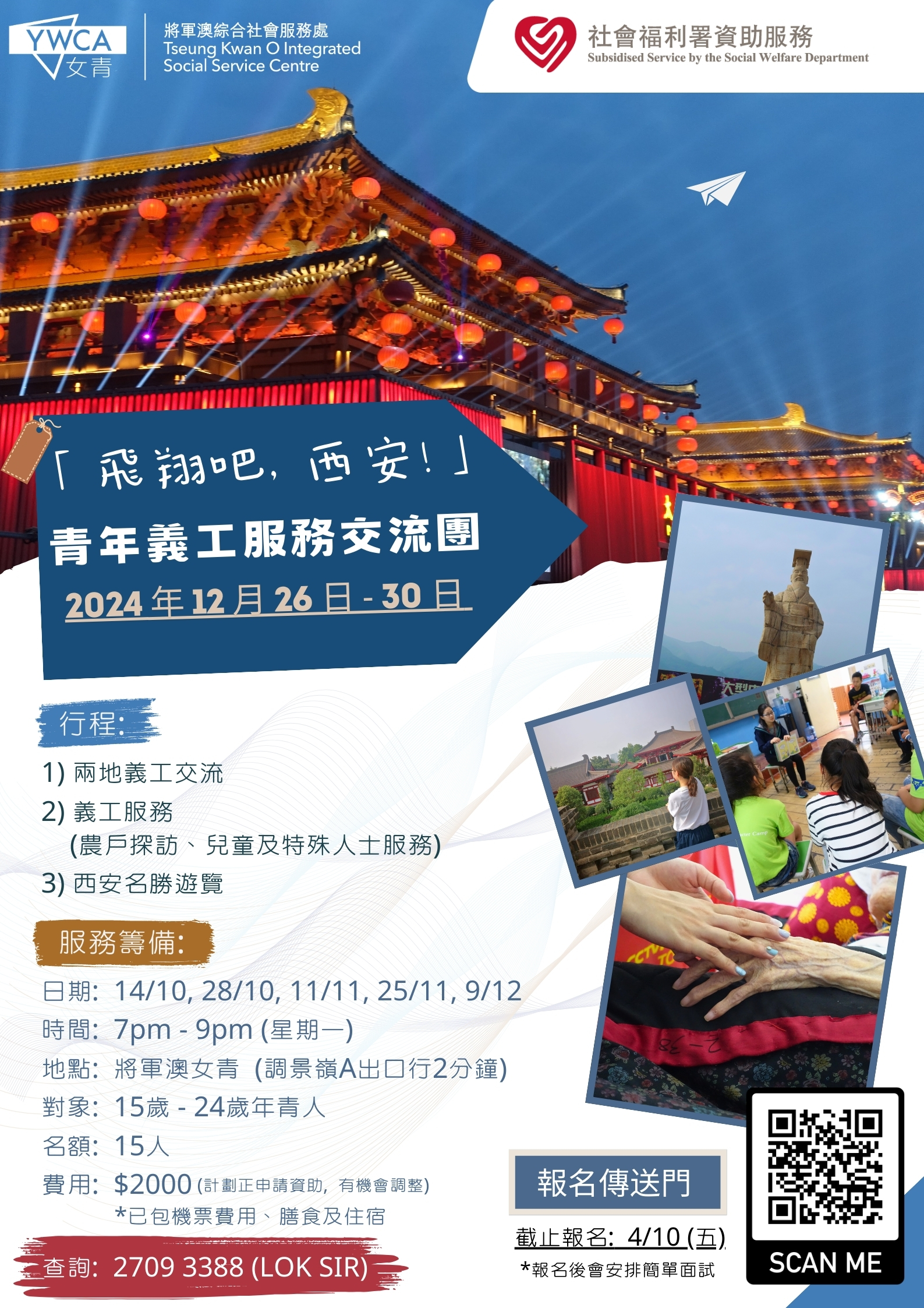 | 「飛翔吧, 西安!」青年義工服務交流團 | 香港基督教女青年會將軍澳綜合社會服務處 | Download Here | 2024-10-4 |