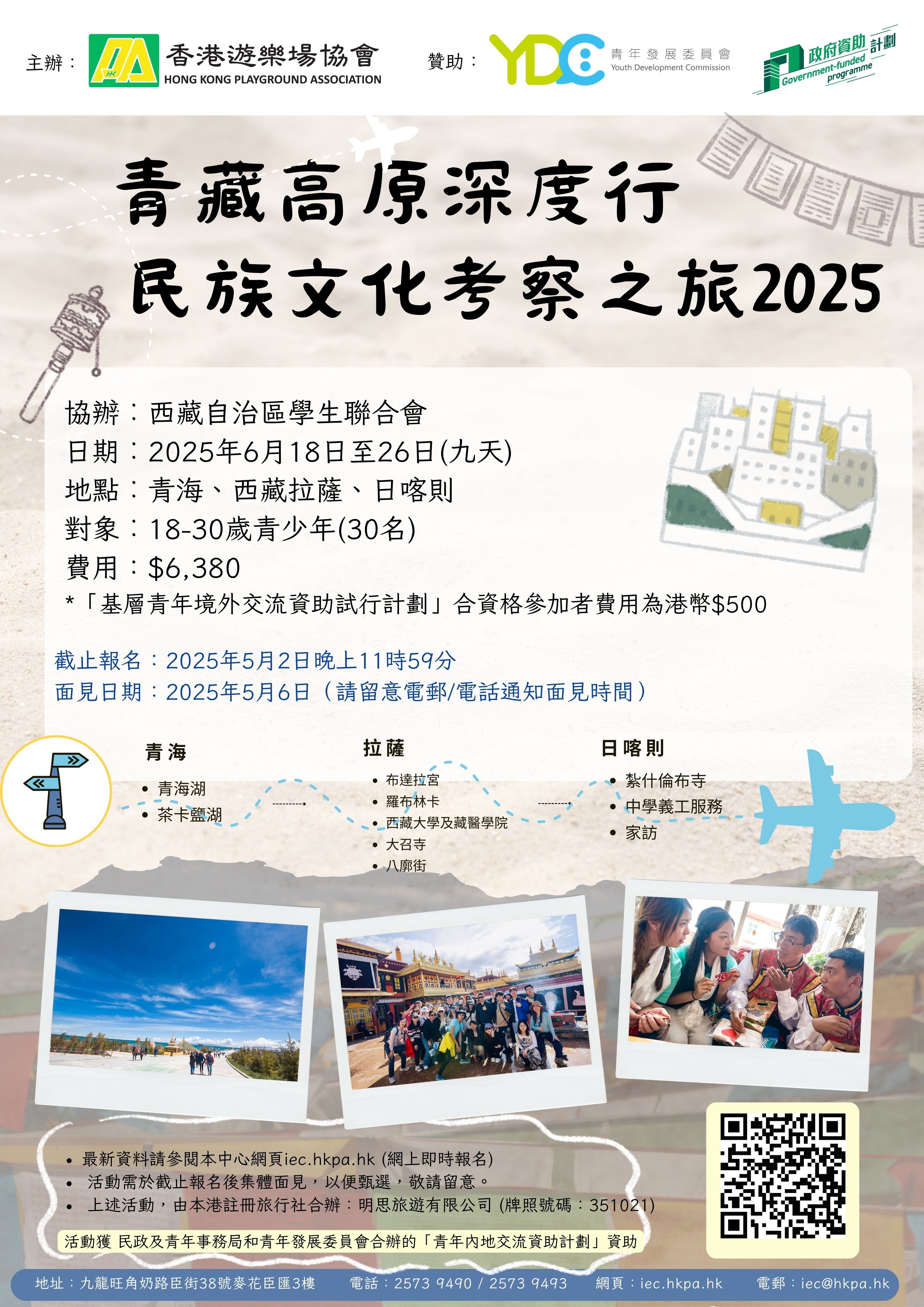 | 青藏高原深度行-民族文化考察之旅2025 | 香港遊樂場協會 | Donwnload Here | 2025-5-2 |