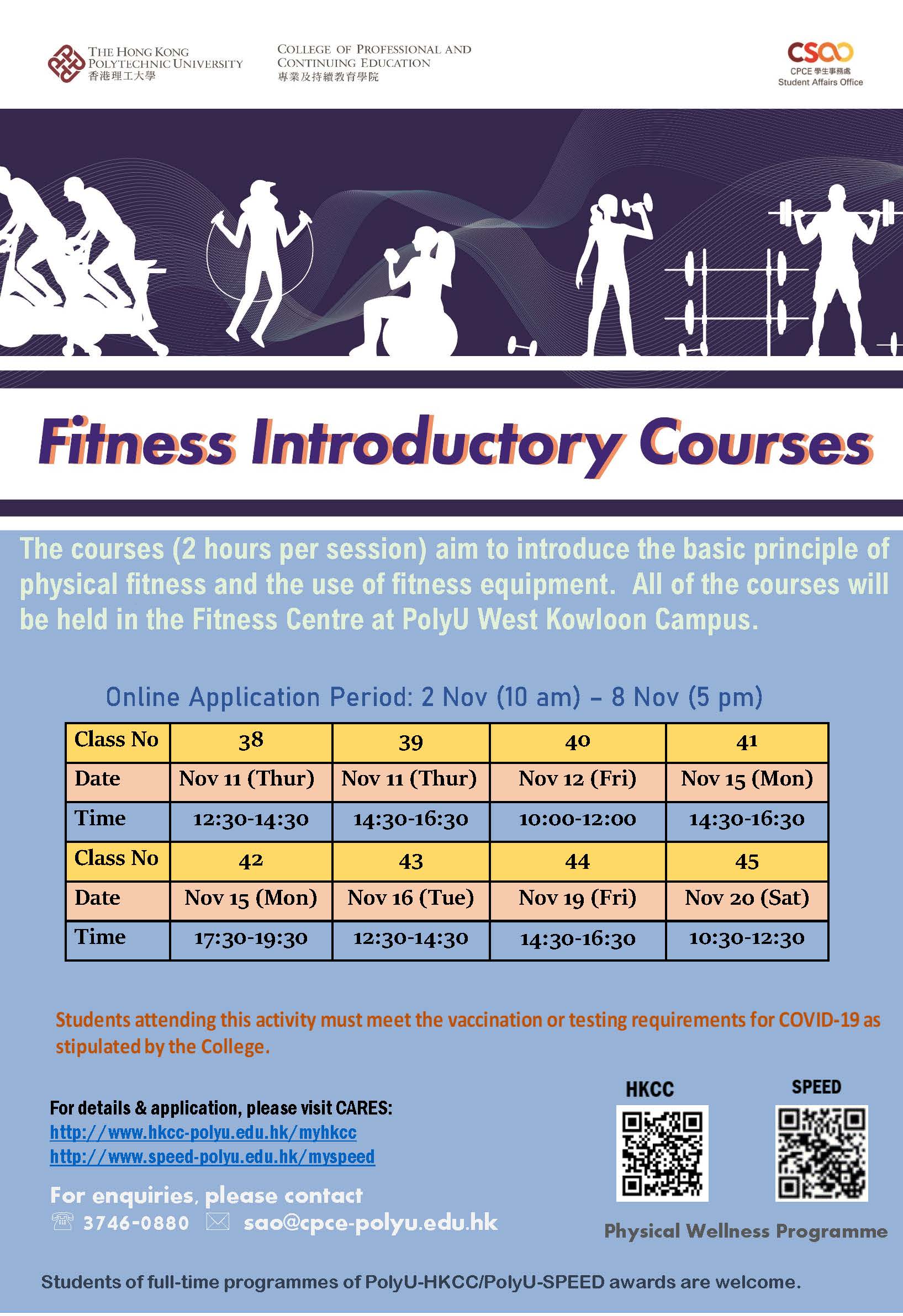 The course aims at introducing basic principles of physical fitness and the use of the equipments in the Fitness Centre. Students who attended the course will become eligible user of the Fitness Centre. Important Notes: - Student should apply the course through CARES according to the application period; - Successful applicants are reminded to attend the course punctually. Those who are more than 5 minutes late may not be allowed to attend the course and his/her place will be released to walk-in applicants. - Walk-in applicants are welcomed if there are vacancies. - Successful applicants should put on proper sports wear (NO JEANS ALLOWED) and bring the completed PAR-Q form (Physical Activity Readiness Questionnaire) attached to the instructor in the first lesson.