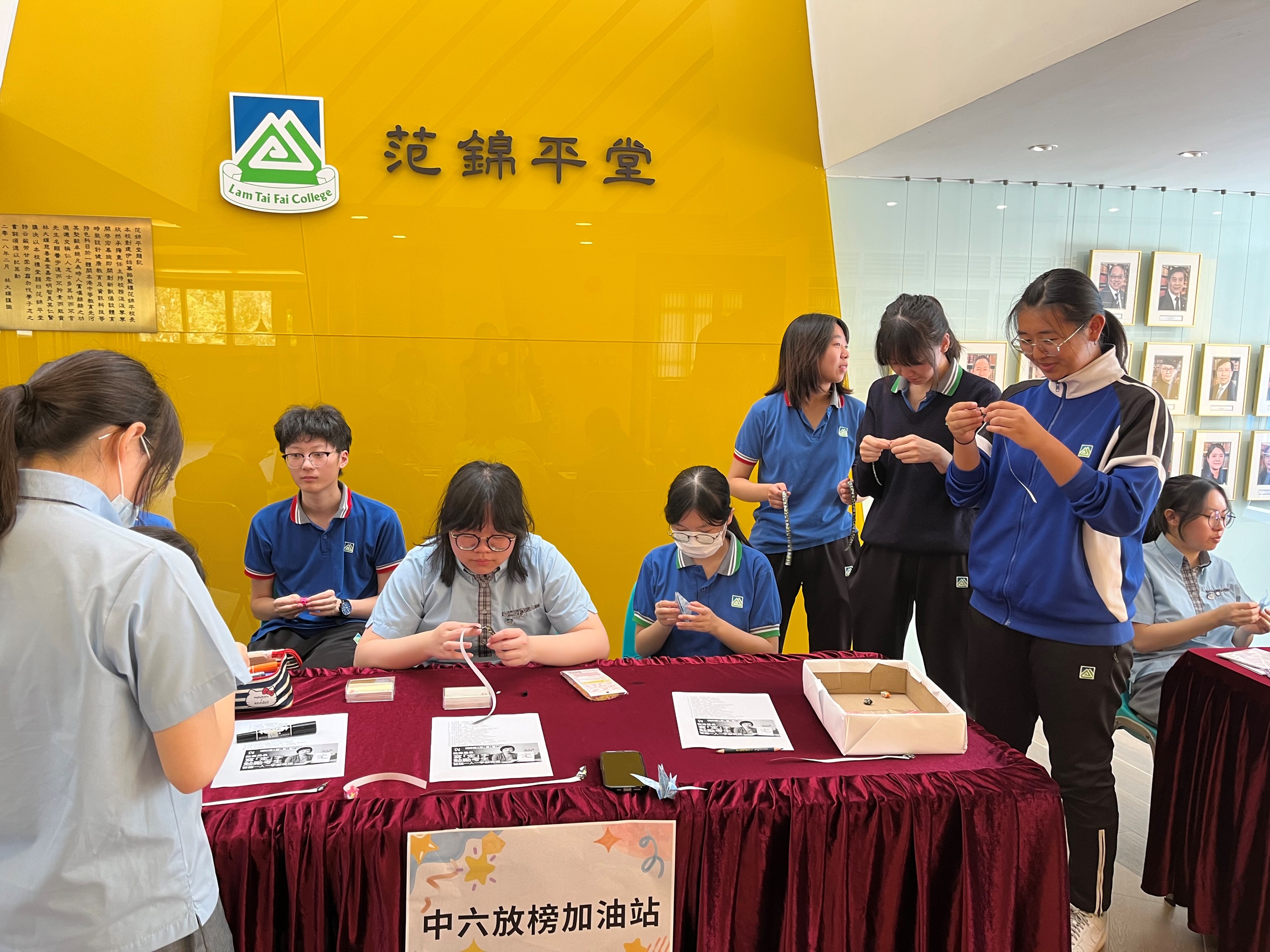 在中學文憑試放榜前夕,服務隊成員在DSE加油站教導同學摺紙,並在摺紙和心意卡上寫上祝福語句。