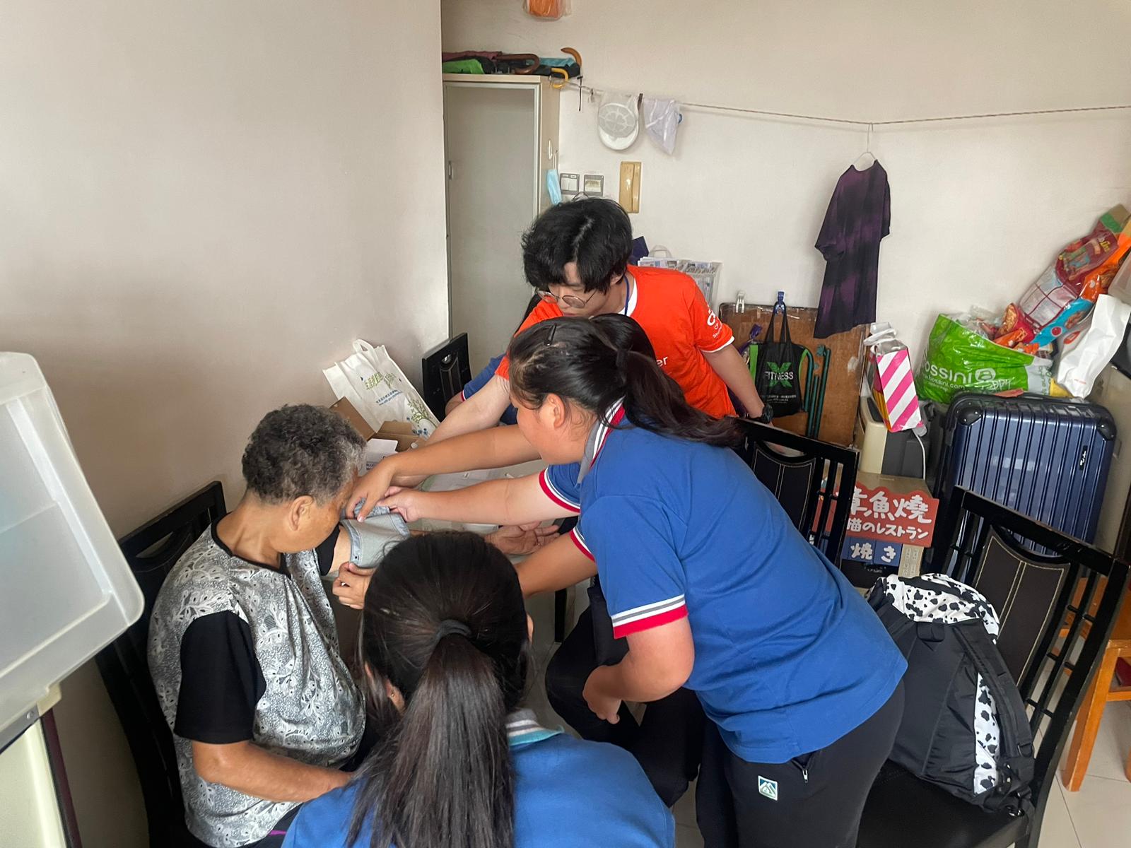 在基督教香港信義會善學慈善基金關宣卿愉翠長者鄰舍中心的悉心安排下,服務隊同學分為八小隊,每小組到兩戶長者家中為長者量度血壓,並送上福袋和關懷。