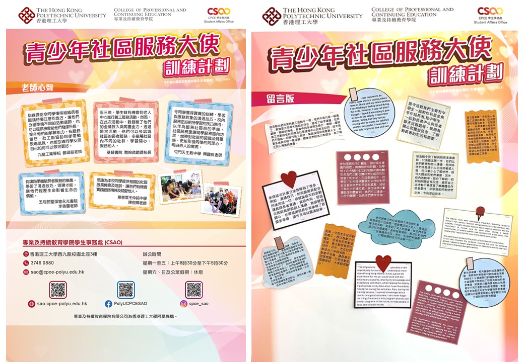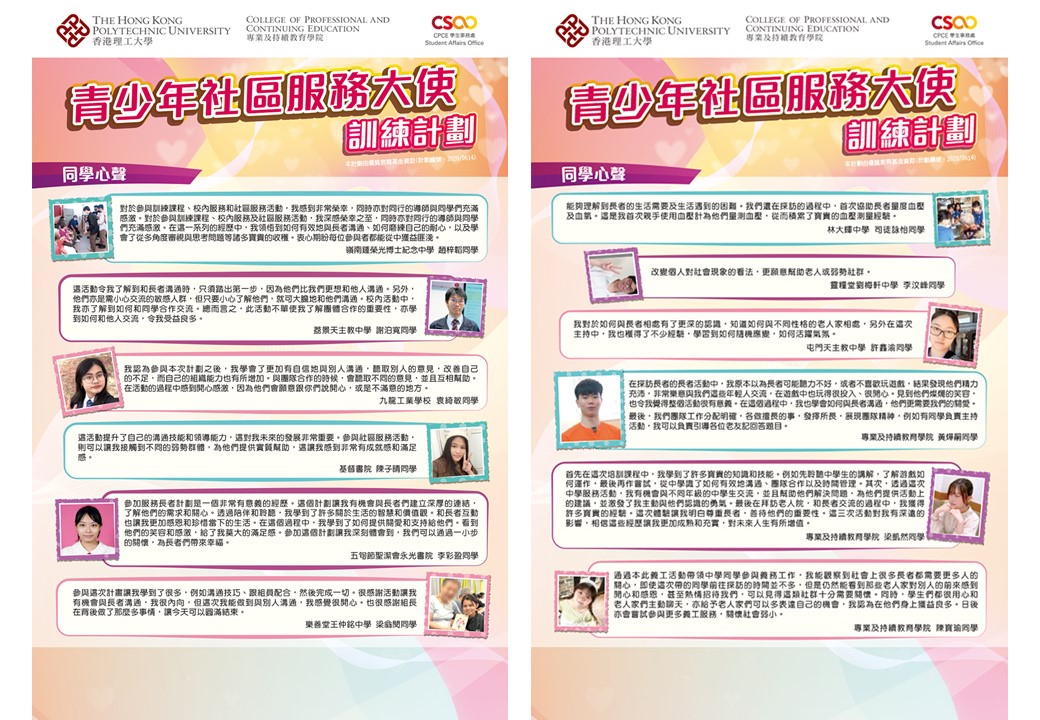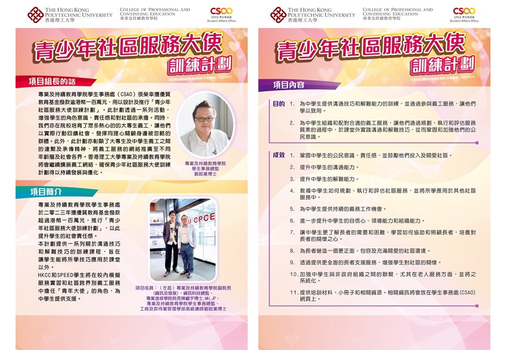 專業及持續教育學院學生事務處獲優質教育基金撥款超過港幣一百萬元,推行「青少年社區服務大使訓練計劃」,以此鞏固學生的角色、責任和對社區的承擔。
