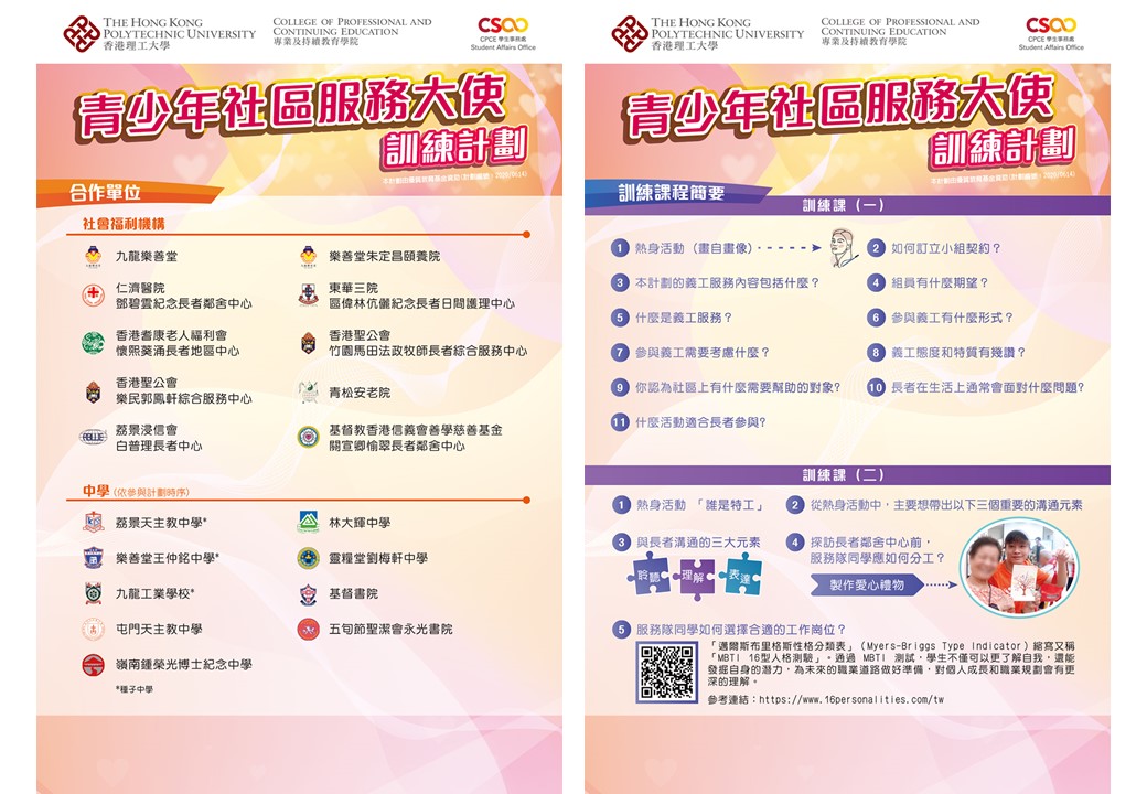 - 為中學生提供溝通技巧和解難能力的訓練,通過參與義工服務,學以致用。